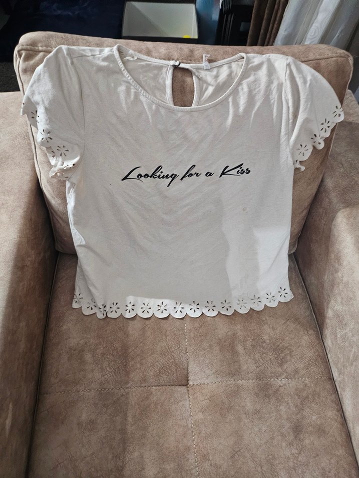 Beyaz renkli, kısa kollu suni süet tişörtü, dantel detaylı ve bol kesimdir. Önünde baskılı yazı bulunur, pamuklu yumuşak kumaştan üretilmiştir.