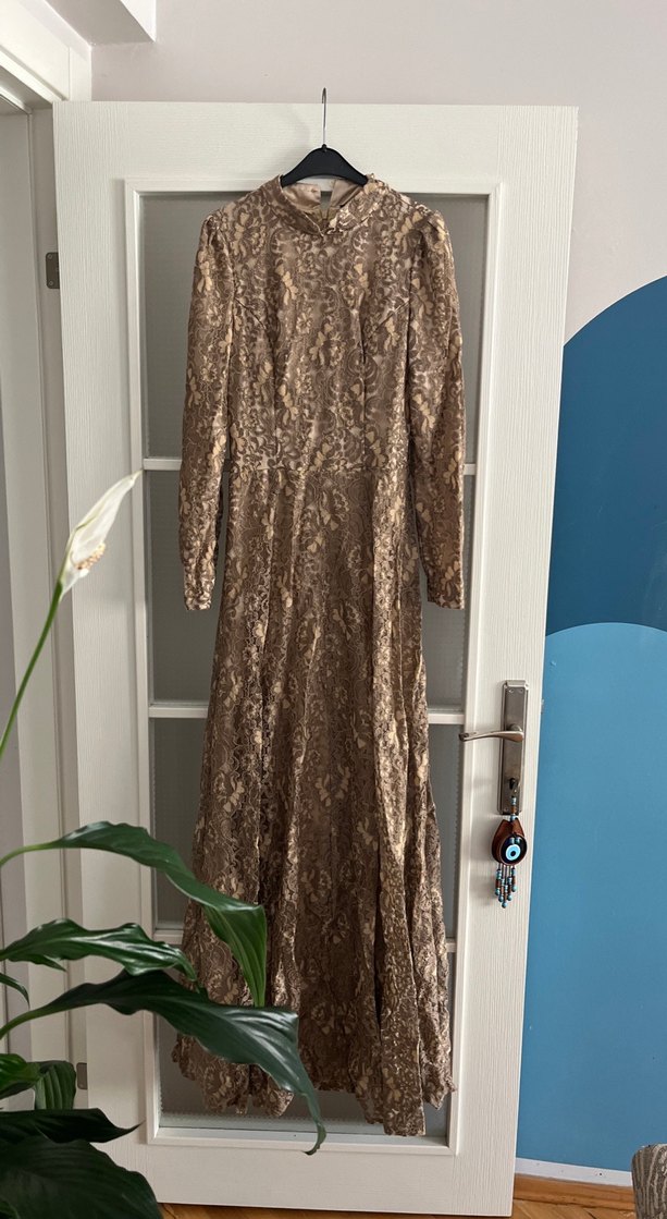 Dantel detaylı, uzun kollu, yüksek yakalı kahverengi desenli uzun elbise. Düzenli kesim ve parlak dokunuşuyla düğünler için uygun.