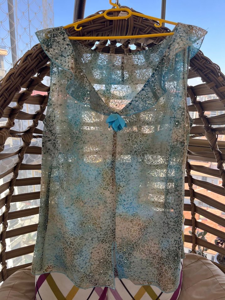 Dantel detaylı, V yakalı, turkuaz renkli, bağlama desenli, bol kesim, kolsuz hamile tunik. Midi boyda, dış mekan kullanımı için uygun.