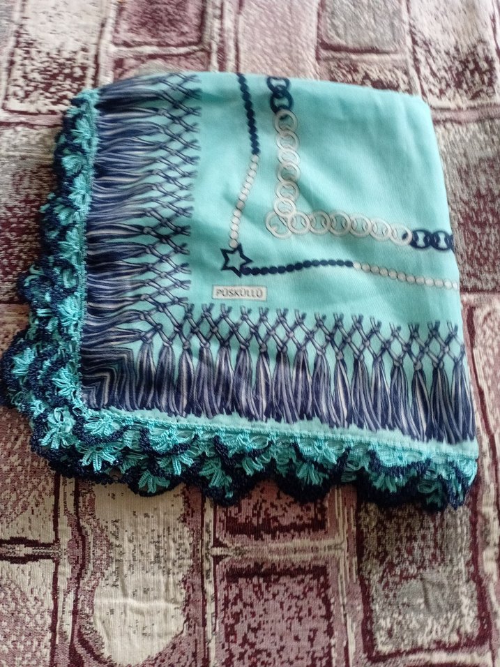 Turkuaz renkte, dantel detaylı, bohem tarzda kadın atkısı. Örgü kumaş ve zarif desenler içerir. Üzerinde 'POSAULLO' etiketi bulunur. yazma