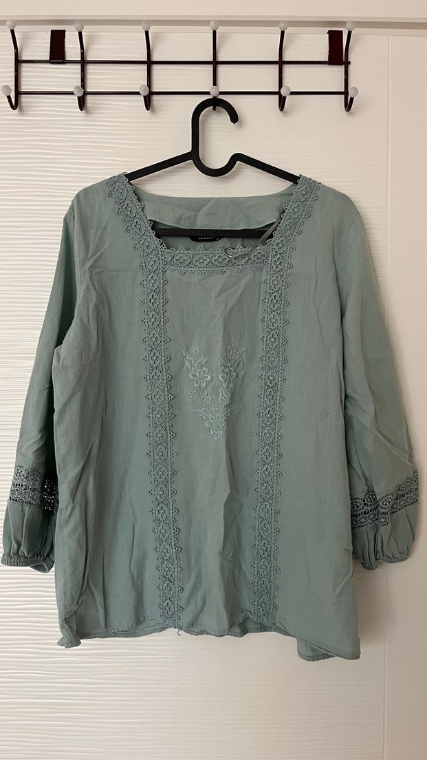 Turkuaz renkte, uzun kollu ve yuvarlak yakalı bol kesim bluz. Keten kumaştan, nakış ve dantel detaylarına sahip, günlük kullanım için uygundur.