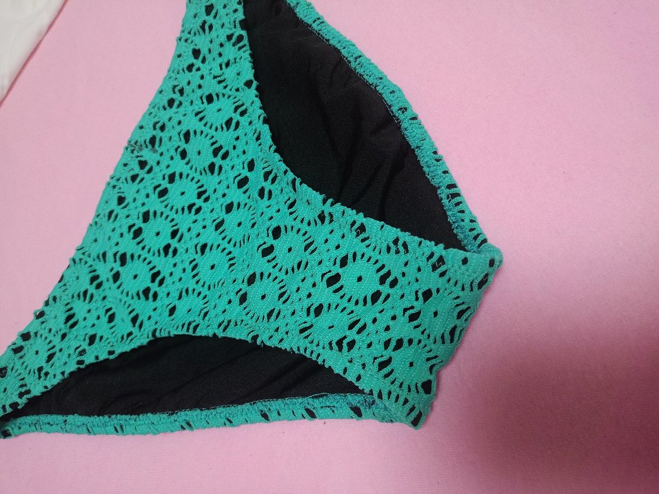 Dantel detaylı, turkuaz renkli ve askılı kadın bikini altı. Renkli ve desenli yapısıyla plajda şık bir bohem tarz sunar.