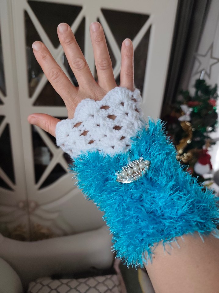 Kadın eldiveni, yumuşak örme kumaş üzerine beyaz dantel ve canlı turkuaz tüylü kumaşla birleşiyor, inci broş detayı bulunuyor. Rahat ve bohem tarz için ideal.
