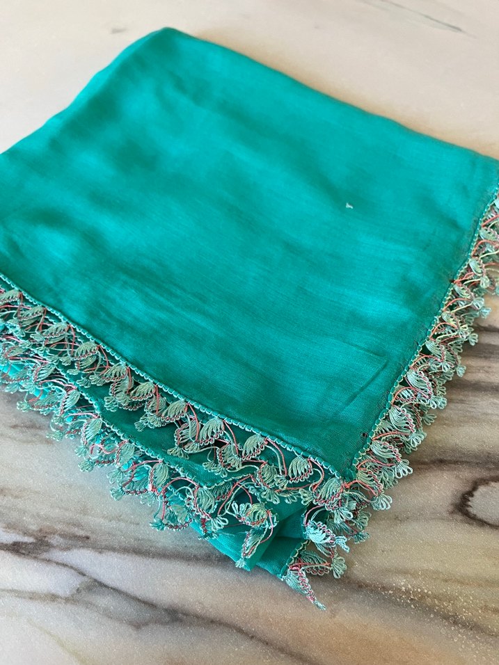 Turkuaz renkte, ipeksi dokulu ve dantel detaylı, parlak bohem tarzda kadın fular.