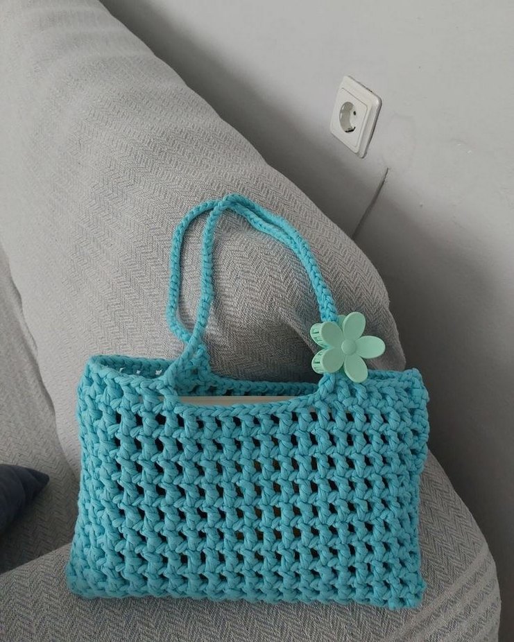 Turkuaz renkli, dantel detaylı örgü kadın çanta. Minimal ve renkli bohem tarzıyla günlük kullanıma uygun.