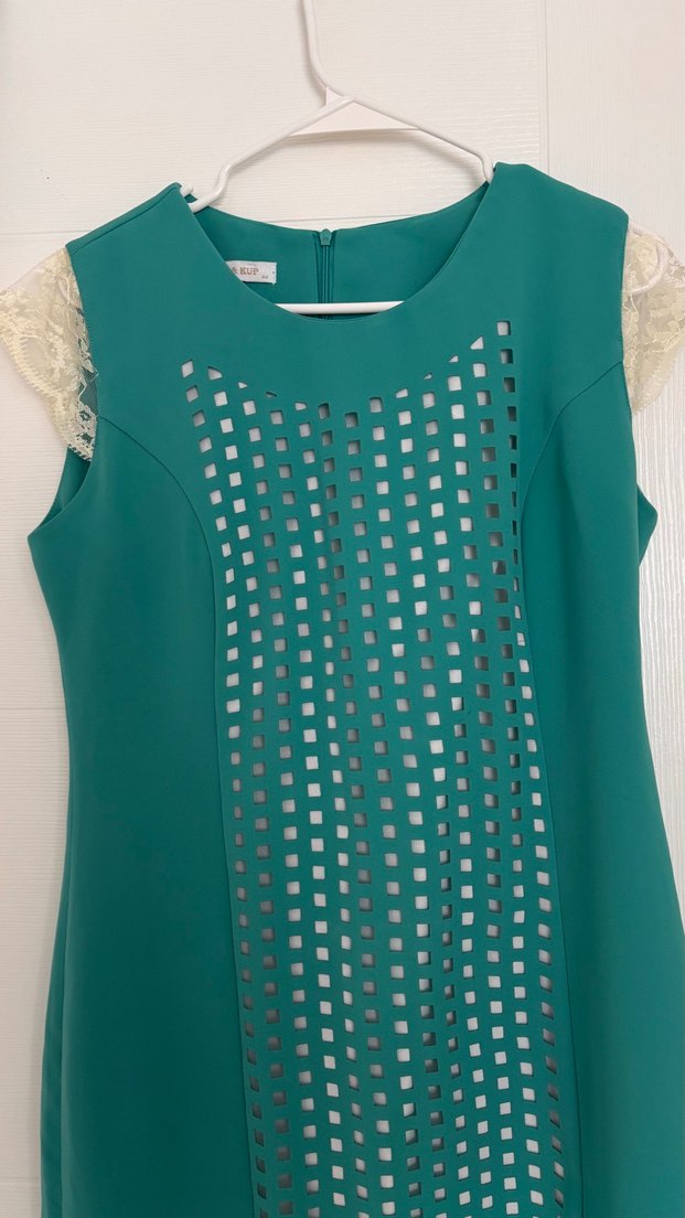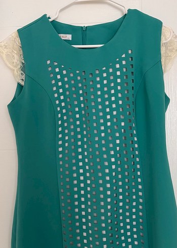 Dantel kolları ve V yakasıyla turkuaz uzun, kolsuz elbise. Baskılı kesik desen ve vücuda oturan kesimle ofis için uygundur. ✨
