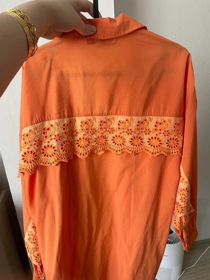 Turuncu, satenimsi kumaştan, yakalı, sırt ve kollarda nakışlı dantel detaylı, bol kesim, uzun kollu bohem tarz gömlek.