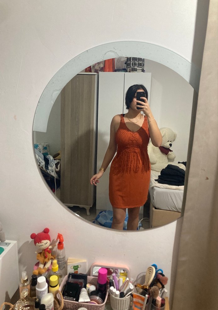 V yaka ve kolsuz tasarıma sahip, yumuşak kumaştan yapılmış, dantel detaylı dar kesim midi elbise. Günlük bohem stil için uygun.