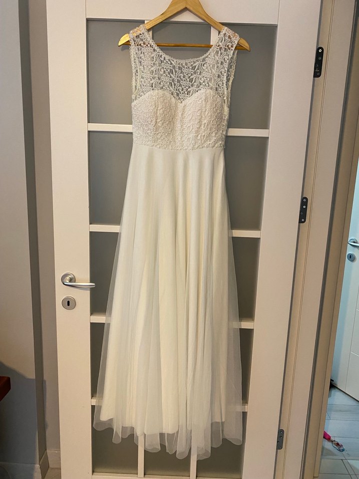 Dantel detaylı üst kısmı ve uzun A kesim elbise. Gelinlik veya Gece Elbisesi olarak kullanılabilir. Sadece 1 kere giyildi. S - M bedenler için uygundur.