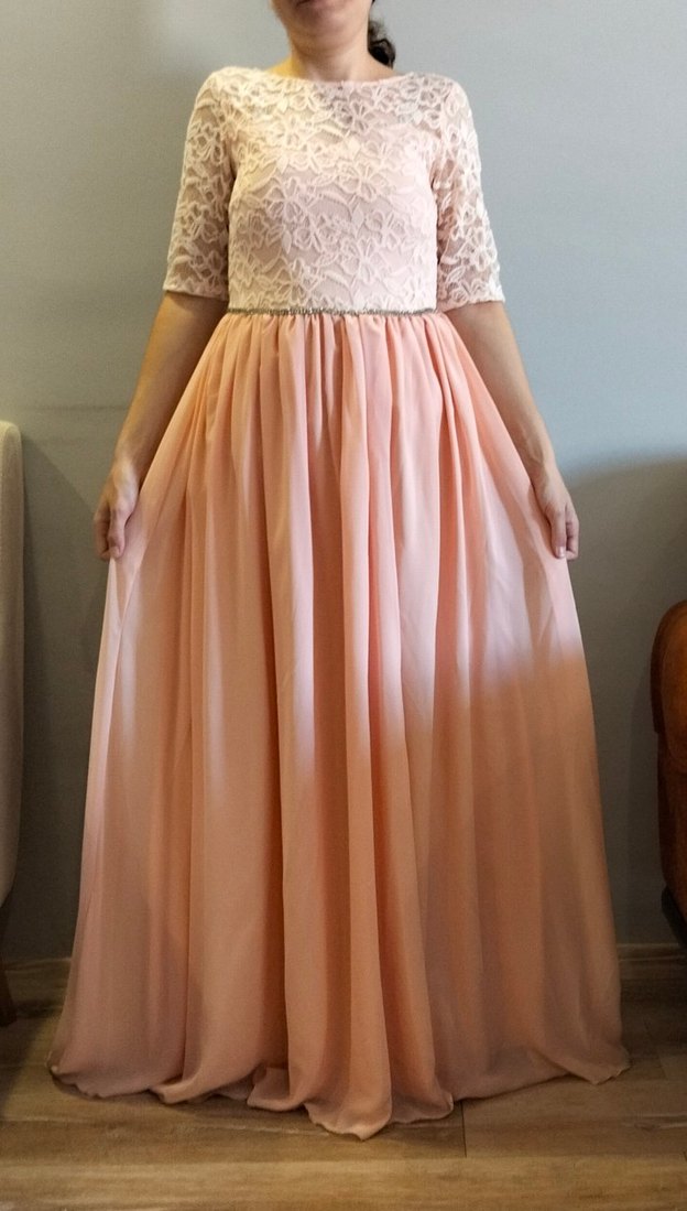 1 defa giyildi. herhangi bir deformesi yoktur.Dantel detaylı, tek renkli ve kısa kollu, tekne yaka uzun abiye elbise. Pastel bej renkte, bol kesimli ve modern klasik tarzda, düğün için uygun bir modeldir.