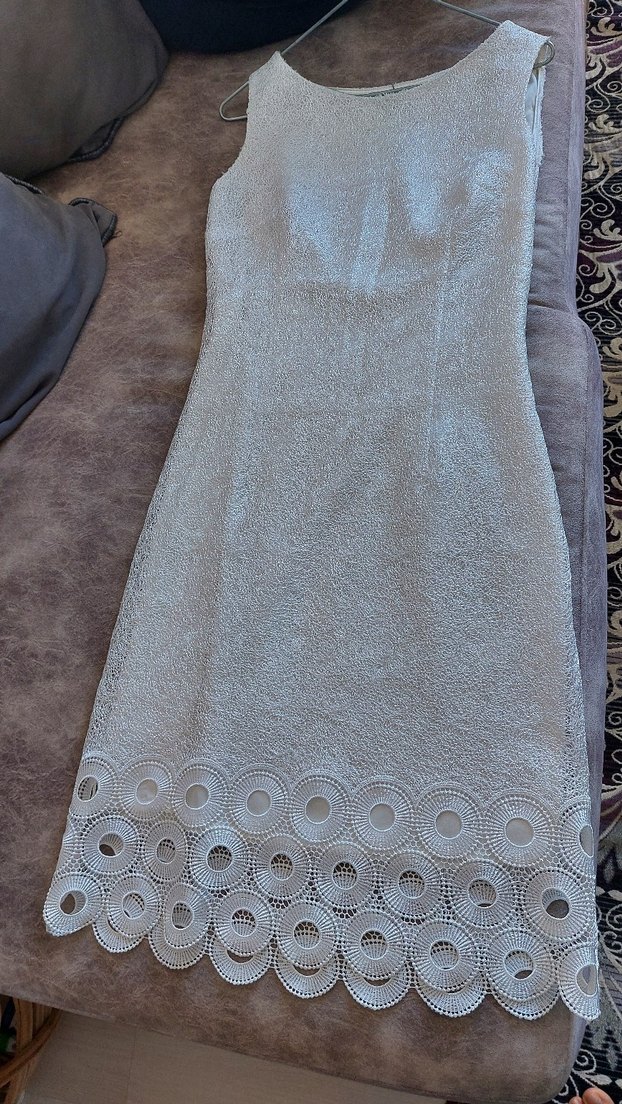Dantel işlemeli, kolsuz ve kruvaze yakalı bu bejbeyazı elbise, yandan fermuarlı klasik zarafet ve bohem tarzı bir araya getirir. Özel davetler için uygun, rahat kesim.