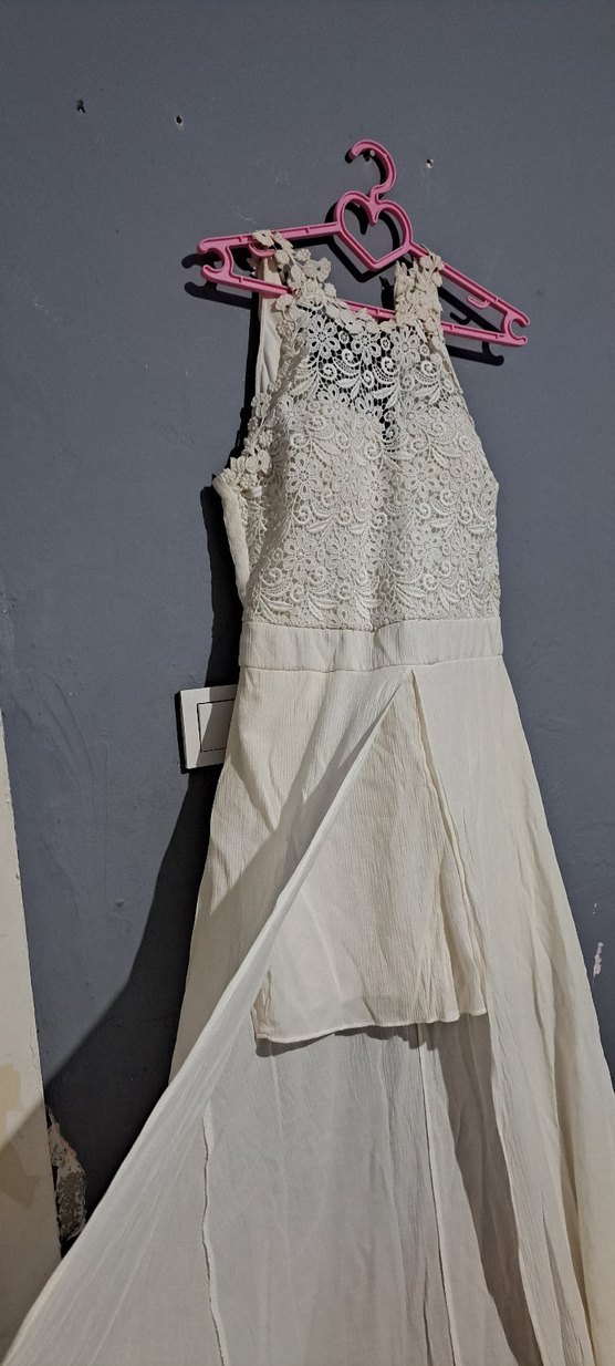Dantel detaylı, straplez yaka ve uzun kollu olmayan, vücuda oturan beyaz abiye elbise. Bohem tarzıyla düğünler için uygun. ici sort sorunu var arkadaşım giydi fermuarı patlak bir şekilde getirdi ben hiç giymedim kenarda durmaktan kirlenmiş alan kişi yıkanması ve fermuarını yaptırması gerekiyor duruşu felan cok guzel