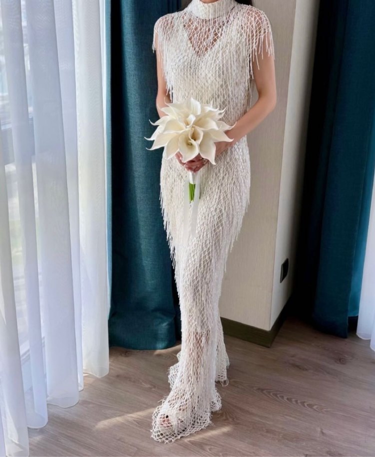 Dantel işlemeli, uzun, beyaz, kolsuz, yüksek yakalı, bohem ve avangard tarzda nişan elbisesi. After ve evden çıkışta da kullanılabilir