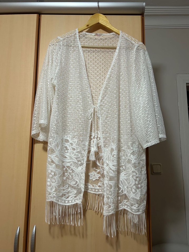 Dantel işlemeli, bol kesim, V yakalı, kısa kollu, püsküllü uzun beyaz örgü plaj kimonosu, bohem tarzı için uygundur. Hiç kullanılmadı etiketi yok