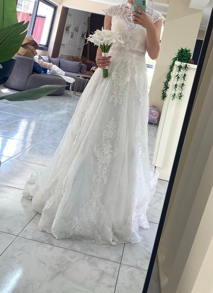 34 beden tadilat yapılmadı sadece boyu ayarlandı. 56 kilo 1.70 boy 9 cm topuklu giydim. Kuru temizlemesi yapıldı. Tarlatan ve duvak birlikte gönderilecektir.