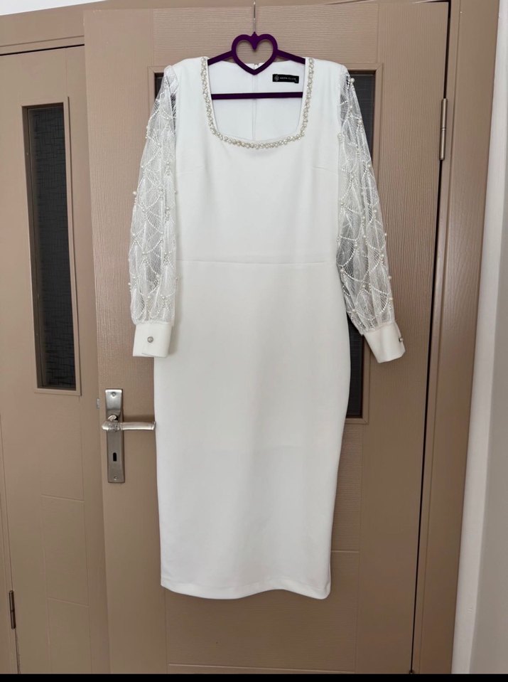 Tek renk beyaz, uzun kollu dantel detaylı, tek parça uzun elbise. Modern klasik ve minimal tasarıma sahip, düğünler için uygun. Sadece 1 saat bekarlığa vedam da giydin