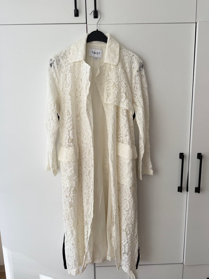 Dantel detaylı ve nakışlı desenli, hafif keten kumaştan uzun beyaz sabahlık. Uzun kollu, geniş kesim ve yaka detayına sahip, sokak modasına uygun bir parça.