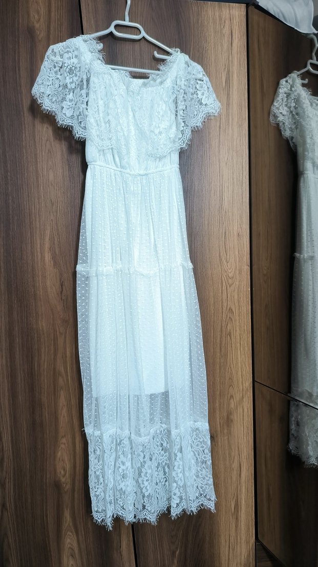 Dantel detaylı, işlemeli desenlere sahip uzun beyaz bohem elbise. Straplez yaka, askılı kol, rahat kesim ve yumuşak örme kumaştan, düğünler için uygun.