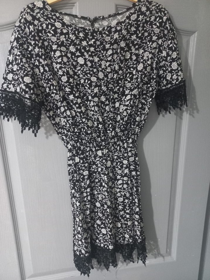 Dantel detaylı kısa kollu, bol kesim, V yaka, siyah desenli bohem elbisedir. Yumuşak örme kumaştan yapılmıştır, günlük kullanıma uygundur.