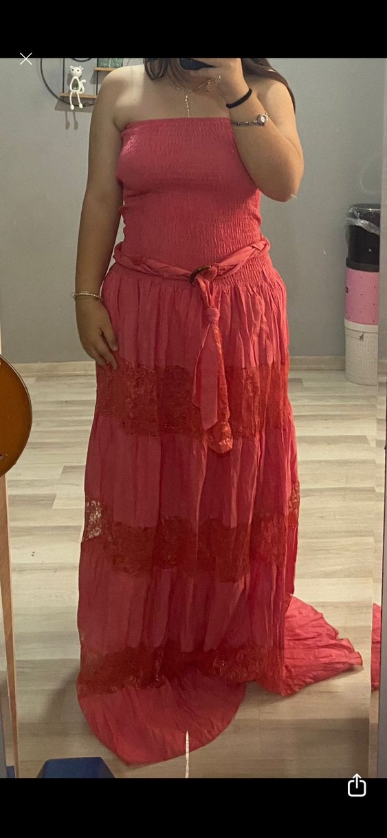 Dantel detaylı, askısız, bol kesim uzun elbise. Keten kumaştan, kemerli ve bohem tarzda, romantik akşamlar için uygun.
