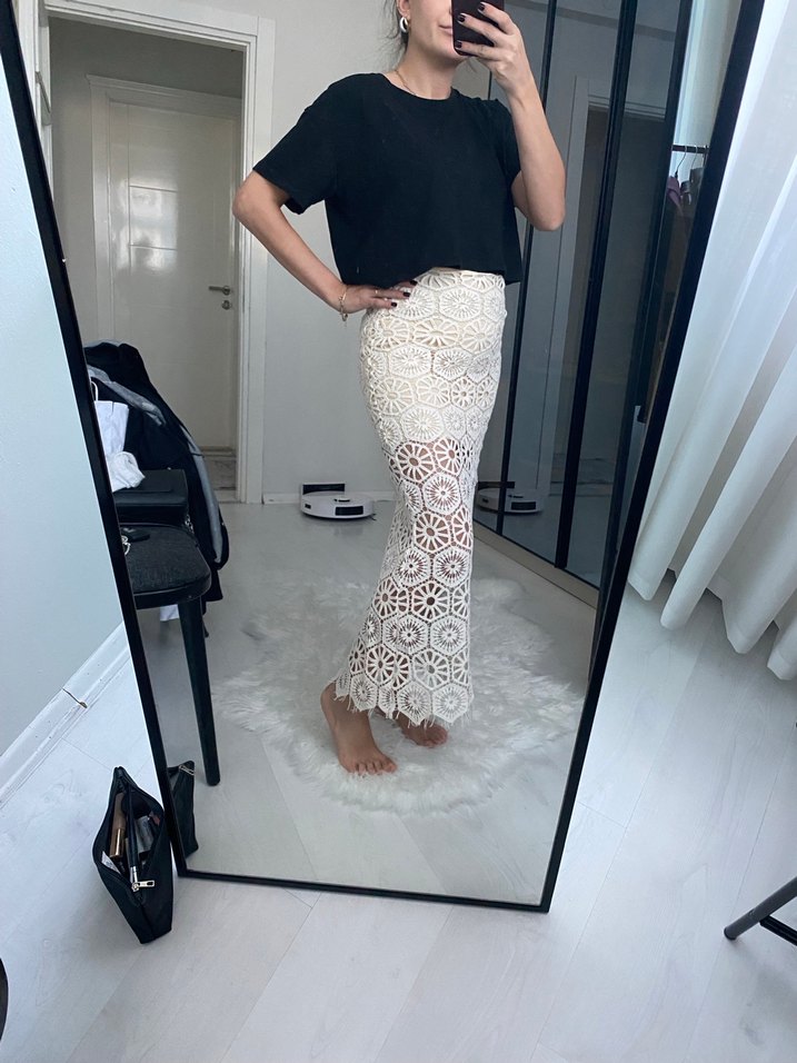 Dantel detaylı, beyaz uzun bohem tarzda, triko kumaştan, bol kesim etek, günlük kullanım için uygundur.