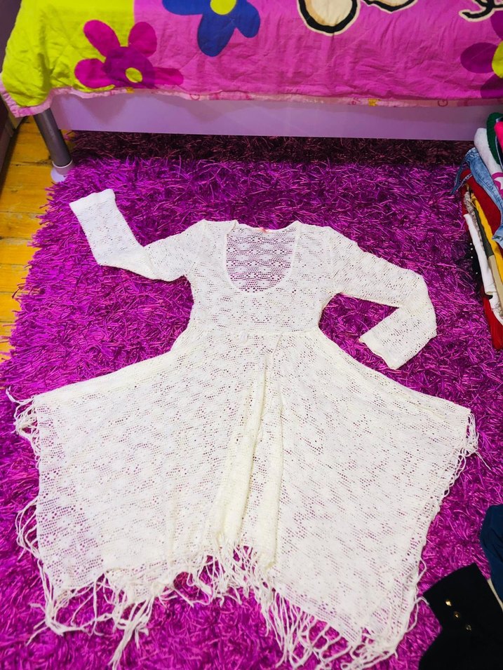 Uzun kollu, V yakalı beyaz dantel elbise, nakışlı desenli ve bol kesimdir. Bohem tarzda, düğünler için uygundur. İç astarı yok plajdada kullanılabilir
