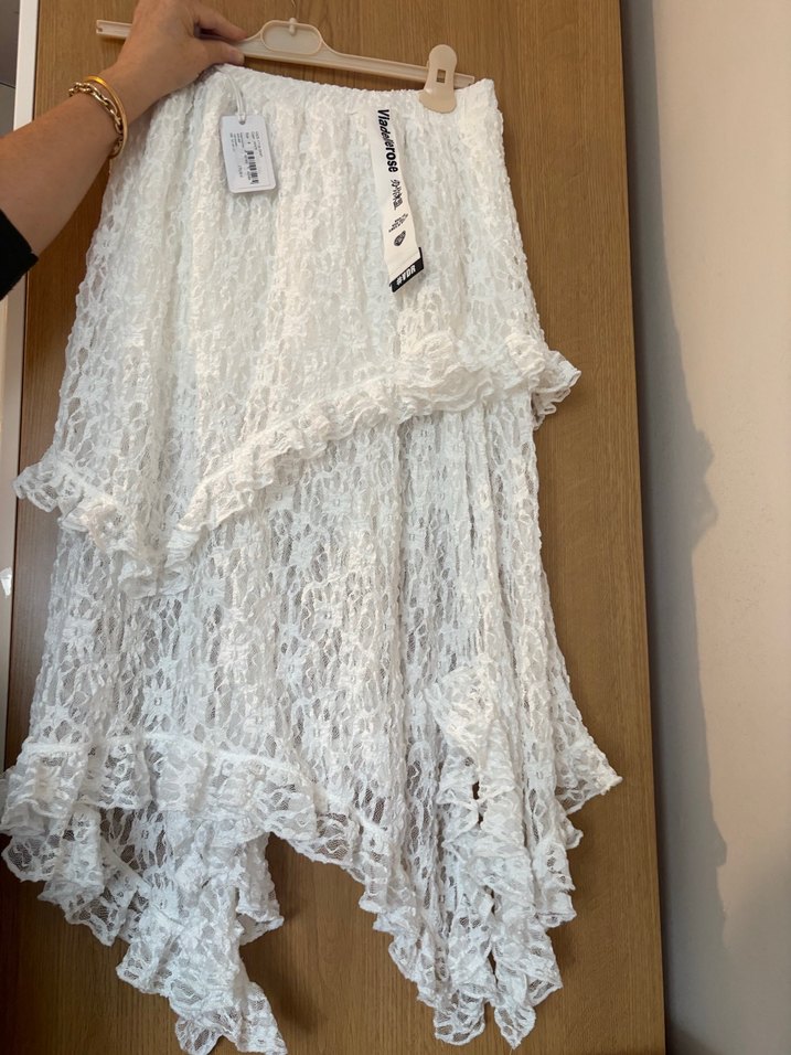 Dantel detaylı, işlemeli beyaz uzun etek. Yumuşak keten kumaştan, bol kesim bohem ve retro tarzlarına uygun. Düğünler için ideal.