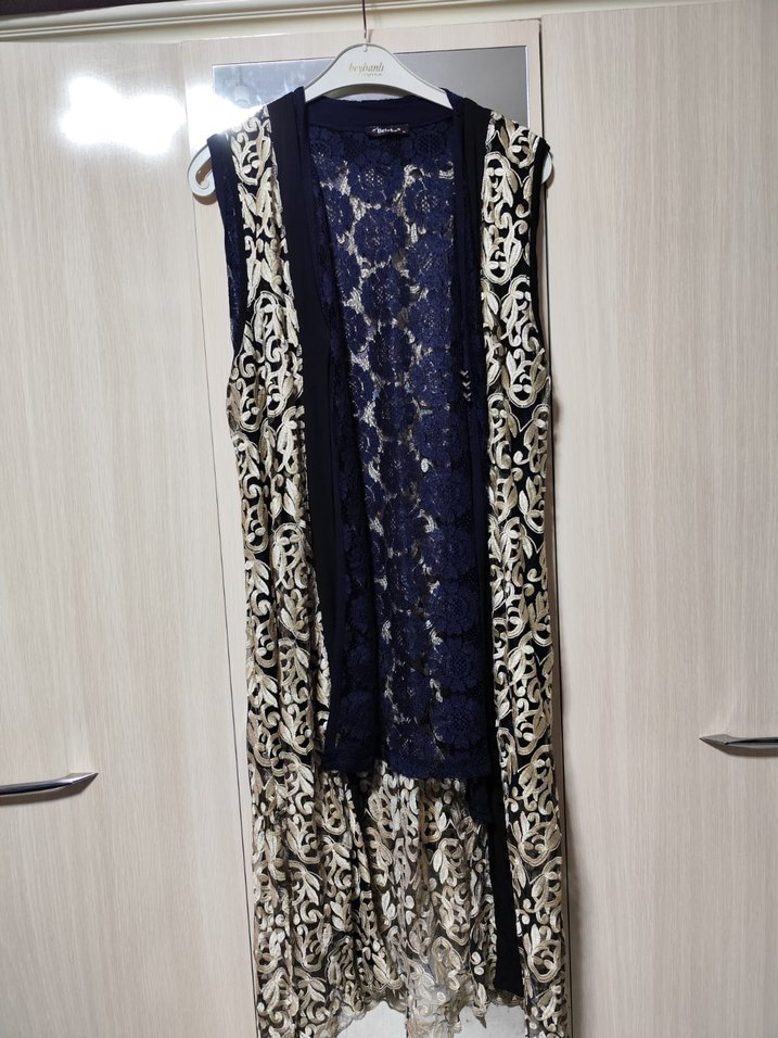 Uzun ve kolsuz bu yelek, lacivert dantel iç detayları ve desenli tekstil dış yüzeyi ile bohem tarzını yansıtıyor. Salaş kesim ve straplez yaka bulunur.