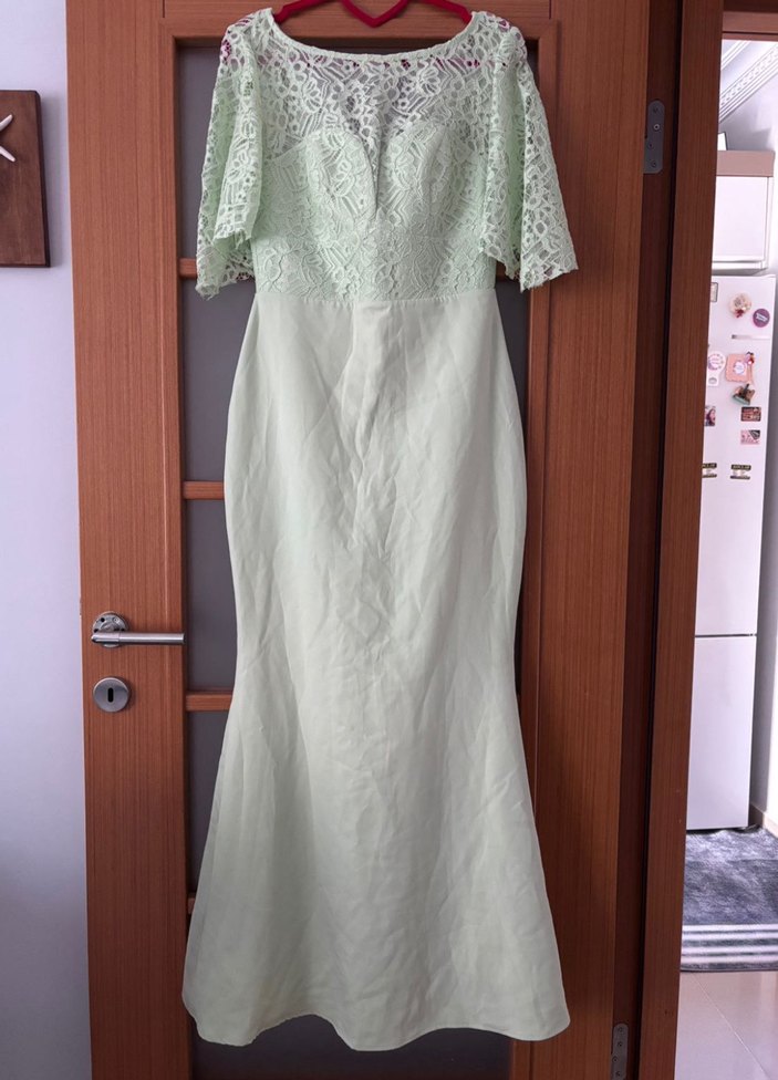 Dantel detaylı üst kısmı ve üç çeyrek kollu, düz uzun etekli klasik ve zarif bir elbisedir. Özel günler için uygundur.