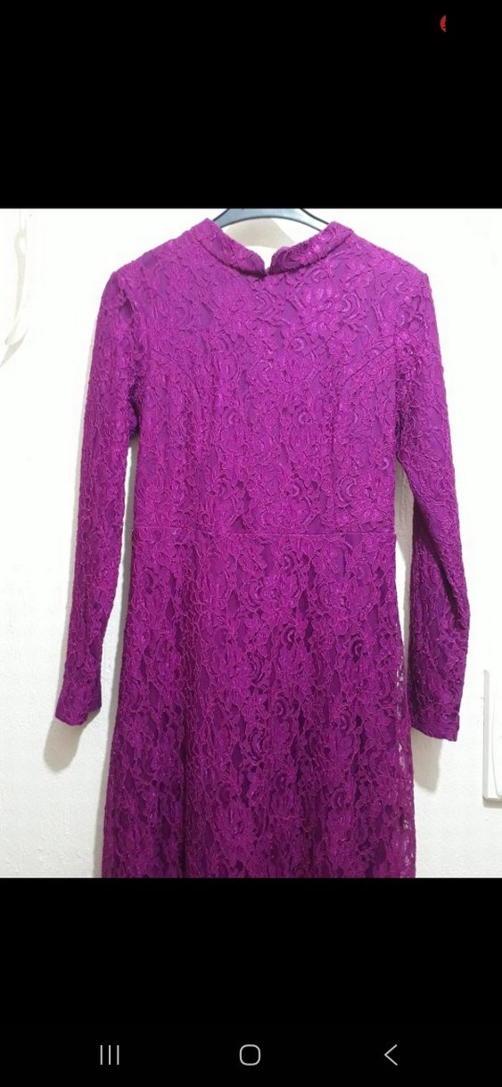 Dantel detaylı, uzun kollu ve V yakalı mor elbise, vintage ve bohem tarzları klasik şıklıkla buluşturur. tesettür dantel kaplı elbise, tesettür abiye, 1 kez kullanıldi,38 ve 40 bedene uygundur, fuşya renk, dantel kaplı astarlıdır.
