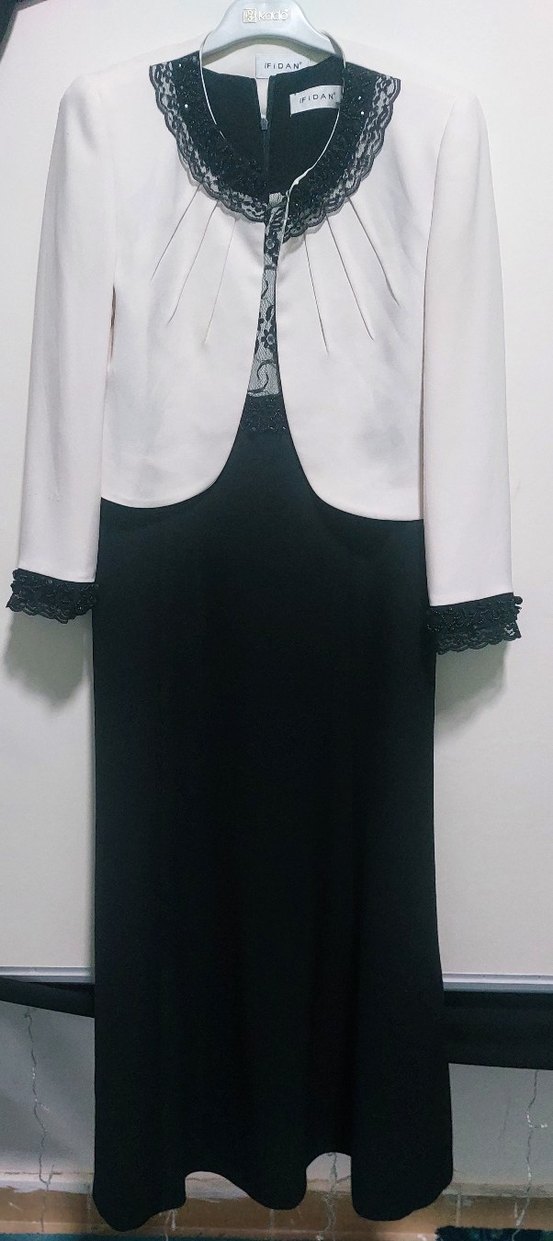 Dantel detaylı, uzun kesim, klasik beyaz ve siyah renklerde kadın takım elbisesi. Notch yakalı, regular fit ve ofis için uygun şık tasarım.