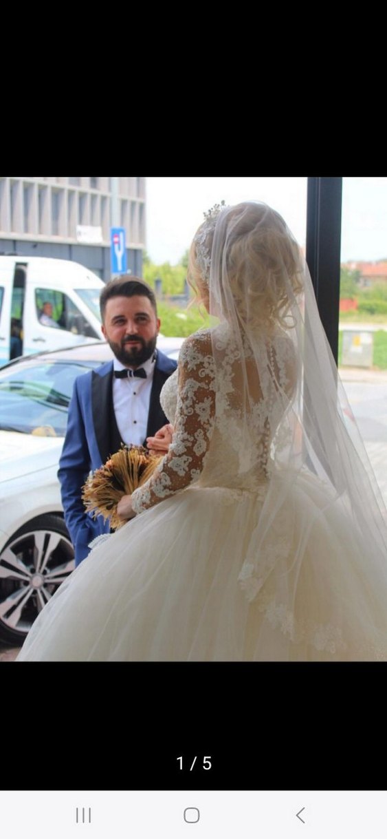36-38 beden uyumlu arkasi ipli ayarlanabilir Beyaz renkte, dantel detaylı uzun kollu, A kesim ve notched lapel yakalı uzun gelinlik. Klasik ve modern tarzı bir arada sunar.