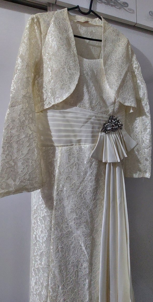 Dantel detaylı uzun kollu, straplez,beli broş süslemeli, beyaz abiye az kullanılmış.Pazarlik payı vardır.