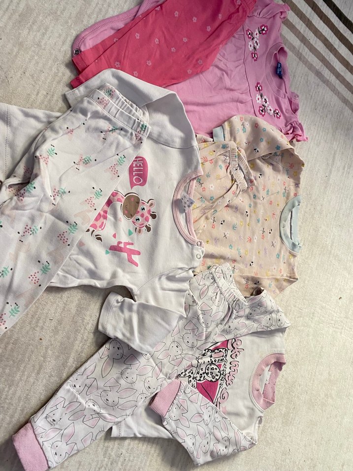 4 tane pijama giyildiler bazılarınla yıpranma mevcut Dantel detaylı, uzun kollu ve pastel pembe tonlarında bebek kız takımı. Sevimli baskılar ve desenler içerir.