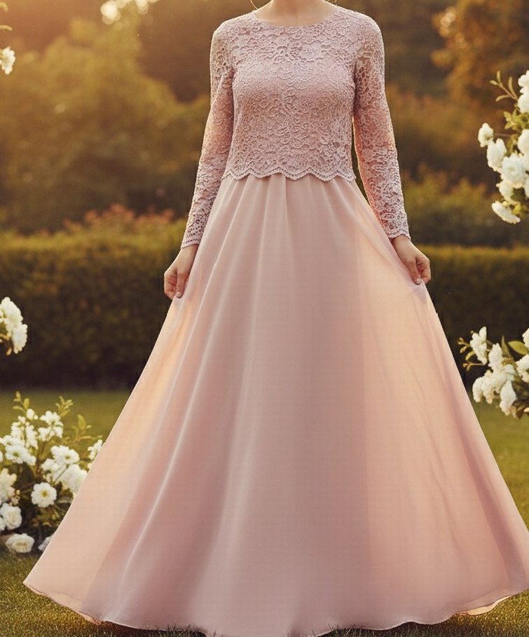 Dantel detaylı, uzun kollu ve yuvarlak yakalı bej nişan elbisesi. Gevşek kesimi ve modern klasik tarzıyla düğünler için uygundur.