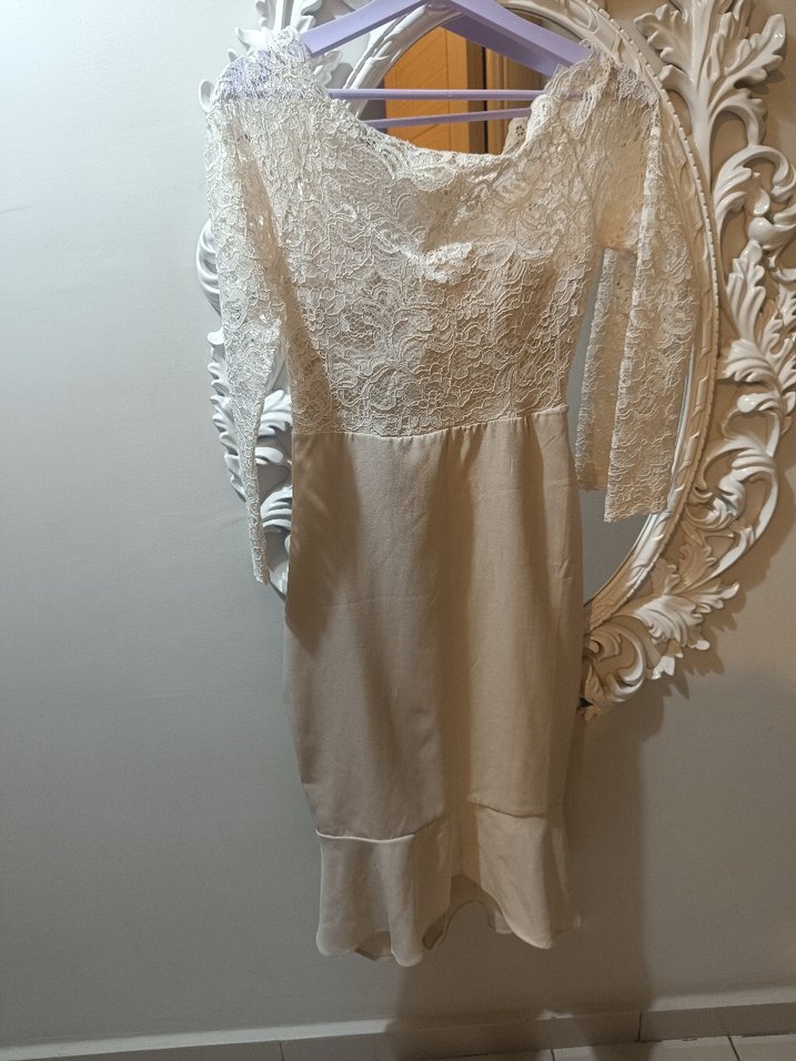 Dantel işlemeli, uzun kollu ve straplez yakalı beyaz abiye elbise. Klasik ve bohem Paris tarzını yansıtır, düğünler için uygun.