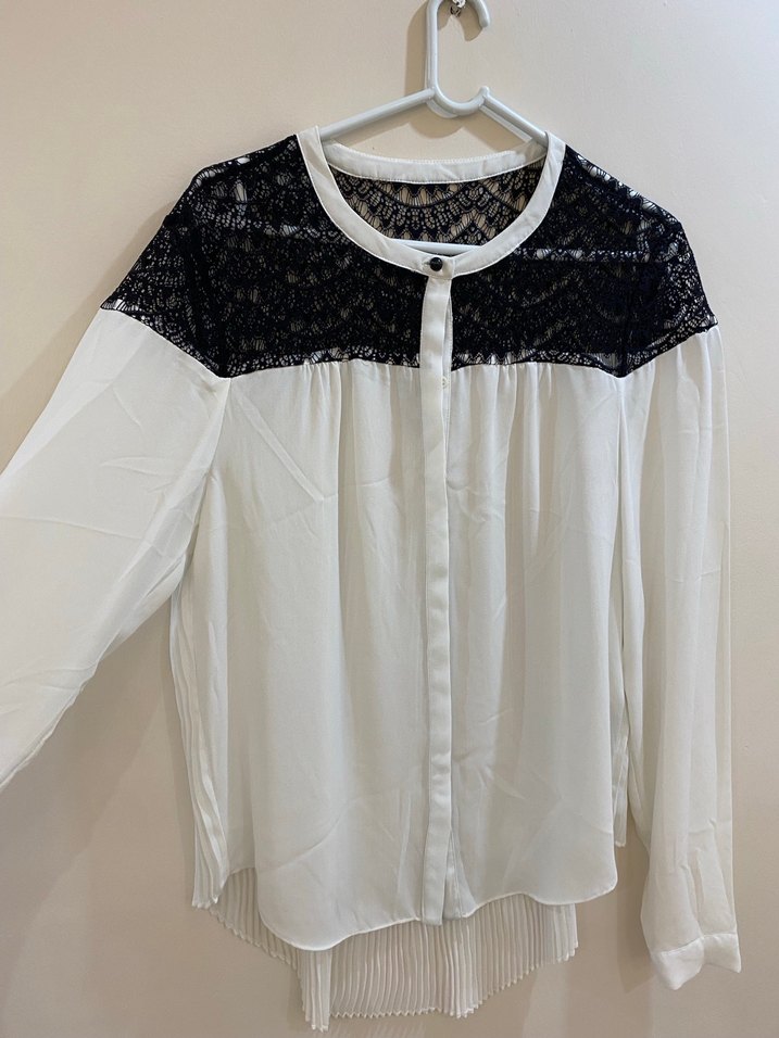 Üst kısmı dantel detaylı uzun kollu beyaz gömlek. Salaş kesim, bisiklet yaka.