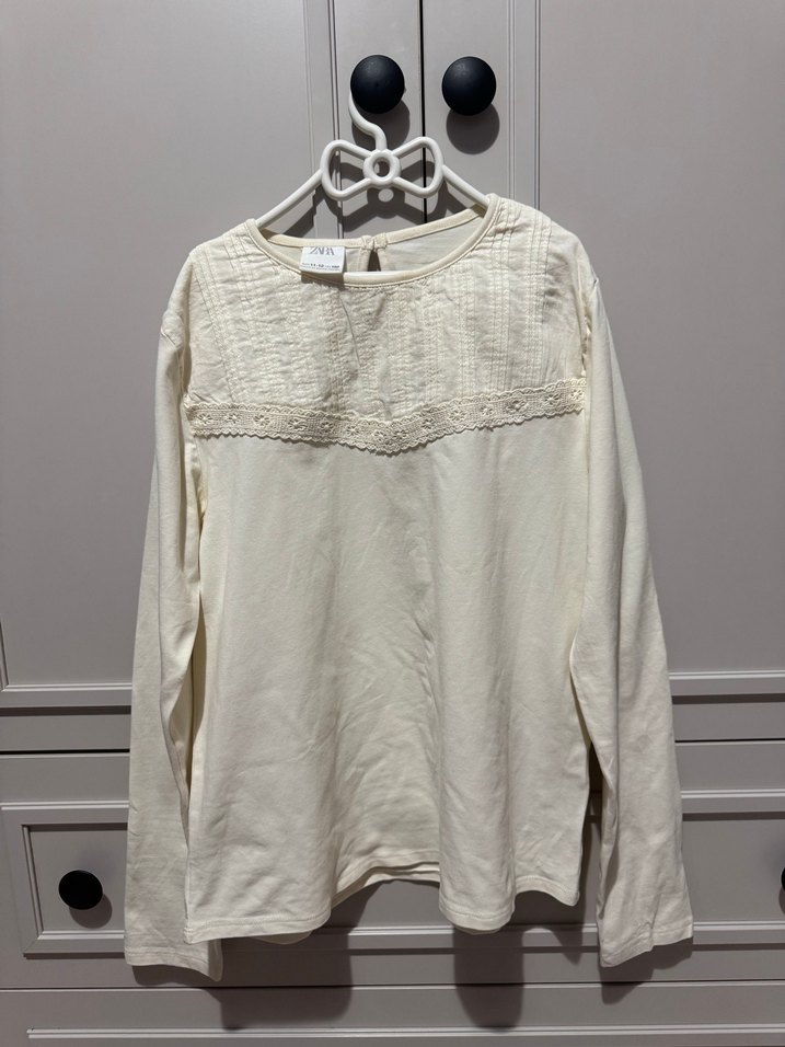 Uzun kollu, yuvarlak yakalı beyaz keten bluz, göğüs kısmında dantel detaylıdır. Rahat ve bol kesimiyle günlük kullanıma uygundur.