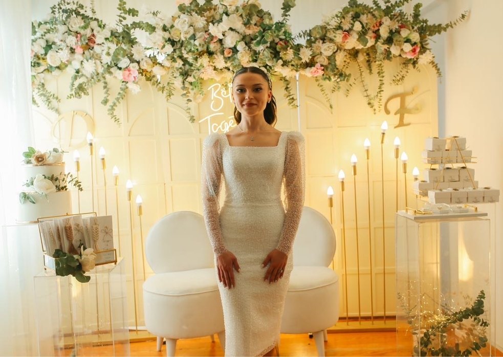 Dantel Detaylı Uzun Kollu Beyaz Nişan Elbisesi