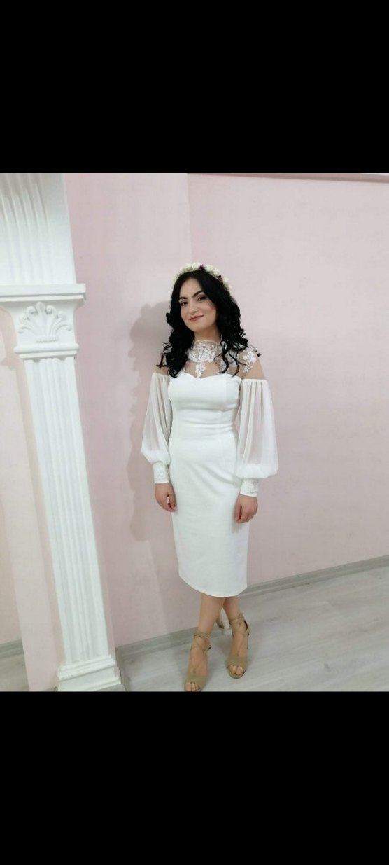 Uzun kollu, dantel detaylı ve etnik desenli beyaz nişan elbisesi, modern klasik tarzda klasik zarafeti yansıtıyor.