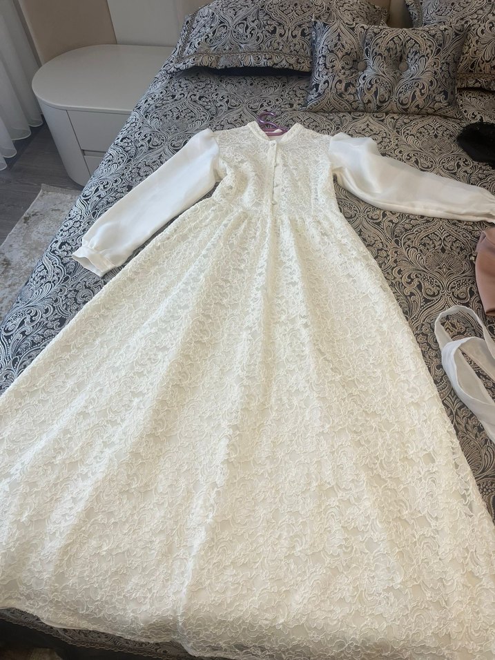 Dantel detaylı, uzun kollu, yüksek yakalı ve bol kesimli beyaz nişan elbisesi, vintage ve klasik zarafeti yansıtıyor.