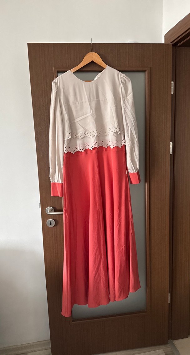 Uzun kollu, yuvarlak yaka ve bel kısmında dantel detaylı, bol kesim elbise. Beyaz üst ve mercan alt renkte, yumuşak sentetik kumaştan, düğün için uygun.
