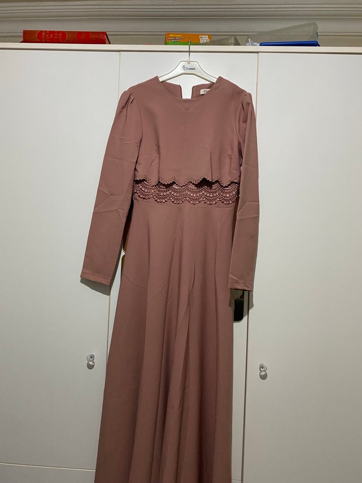Dantel detaylı, uzun kollu ve V yakalı, yumuşak sentetik kumaştan yapılmış bej renkli, sade ve şık uzun elbise.