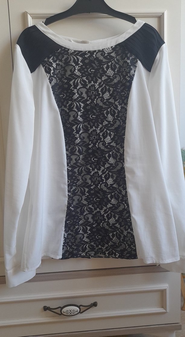 Beyaz yuvarlak yaka ve uzun kollu olup, rahat kesimdedir. Ortasında siyah dantel detay bulunmaktadır, ofis için uygundur.