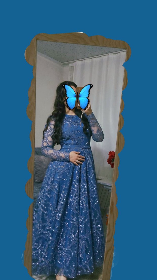Dantel Detaylı Uzun Kollu Mavi Abiye Elbise