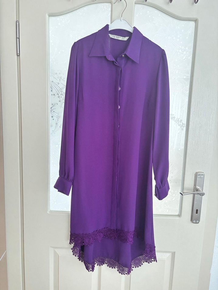 Uzun kollu, dantel detaylı ve parlak mor renkte, ipeksi dokulu bol kesim tunik. Notlu yaka tasarımı ve ofis kullanımı için uygundur.