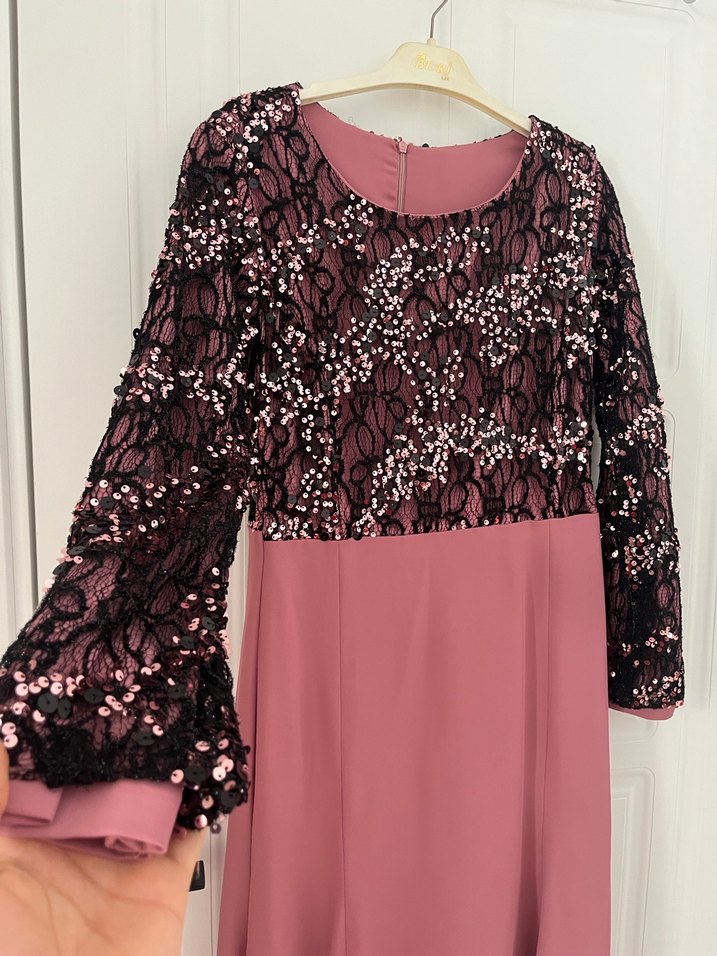 Uzun kollu, tekne yaka ve dantel işlemeli üst kısmıyla klasik şıklık sunan, pembe renkli, vücuda oturan abiye elbise. Romantik akşamlar için uygun.
