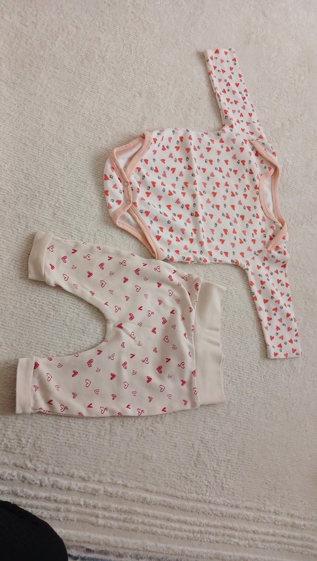 Uzun kollu ve dantel detaylı, pastel pembe renkte bebek kız takımı. Yumuşak kumaş, kalp desenli pantolon ve üstten oluşur.