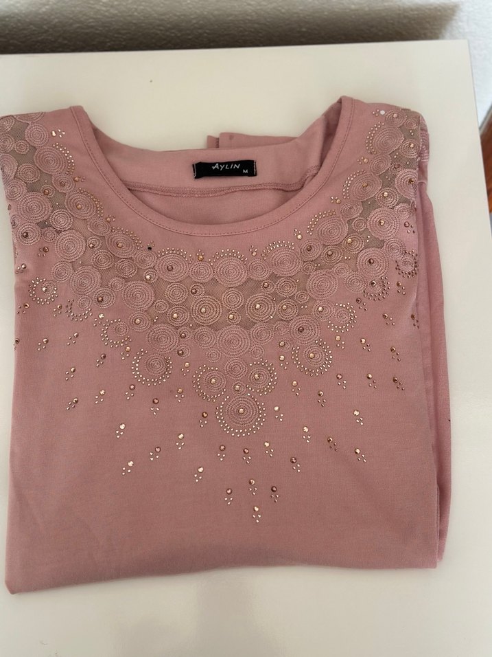 Pembe pastel renkte, yuvarlak yakalı ve uzun kollu, bol kesim kadın bluz. Dantel işlemeli detaylar ve yumuşak sentetik kumaş kullanılmıştır.