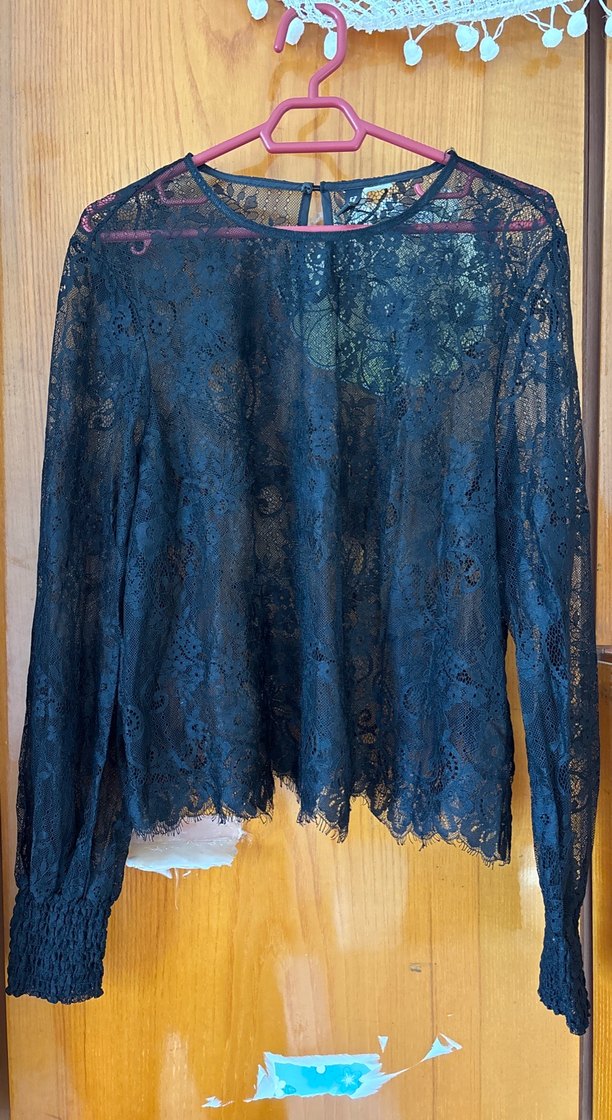 Uzun kollu, dantel detaylı, yüksek yakalı ve bol kesim siyah bluz. Romantik ve bohem tarzıyla özel anlar için uygun.